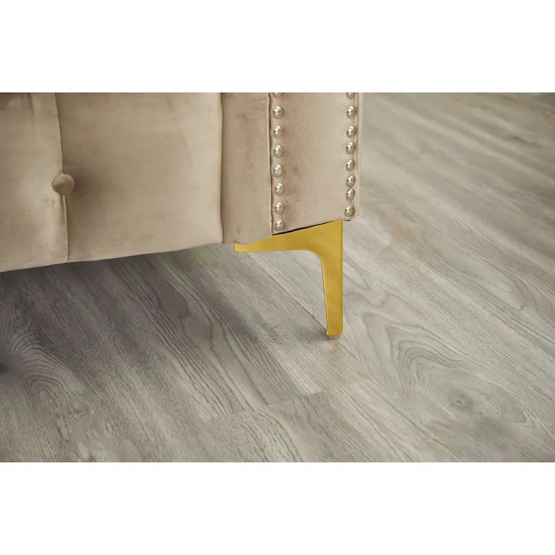 This sofa adds classic glam style to your living room or den. It's built with a solid and engineered wood frame and rests on turned legs with a brown finish. The velvet upholstery features deep button tufting studded that add just the right amount of sparkle to your seating area. This sofa also has deep seating and exceedingly comfortable cushions, specifically designed with your comfort in mind. This sofa is the ideal addition to any living room. It features flared arms, a tufted back, and nailhead trim. Beautifully styled and consciously crafted using materials, makes a welcome addition to any living space.