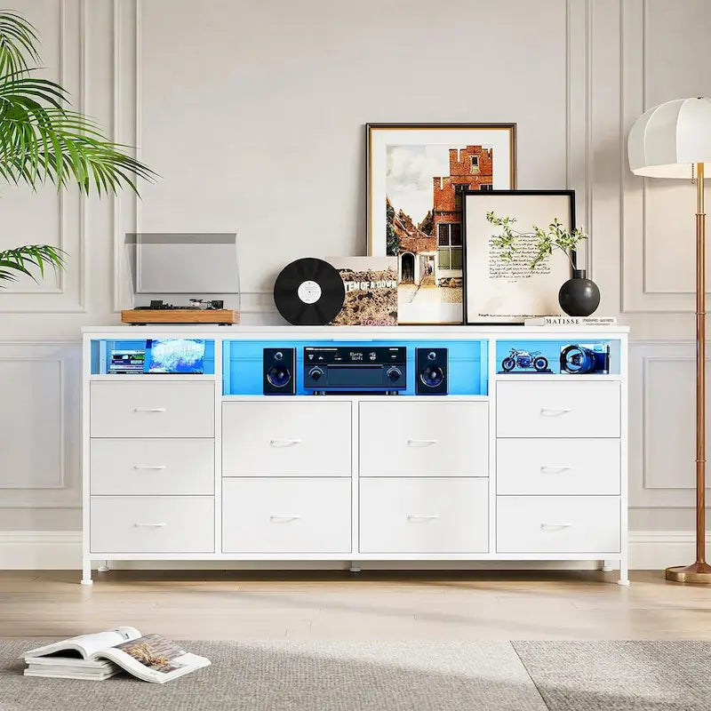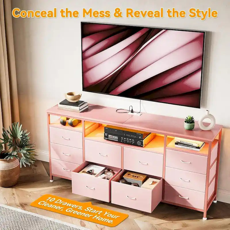 Quick Access to Essentials & 10 Drawer DresserDresser with 10 fabric drawers, provides generous storage capacity, allowing you to neatly organize and store your media devices, DVDs, gaming consoles, books, clothes, blankets, toys, and other accessories, helping you create an organized and stylish living area.Dresser with Power Outlet & LED LightsThe fabric dresser is thoughtfully designed with 2 power outlets and 2 USB ports, allowing you to easily charge your devices without extra extension cords. The LED lights take your bedroom experience to the next level, whether you want a calming blue for relaxation or vibrant red for a lively atmosphere, you can easily set the perfect mood, and you have complete control over the ambiance, allowing you to tailor the lighting to any occasion.Sturdy & Safe & Stable & Careful DetailsOur dresser entertainment center combines a premium fabric finish with a strong wooden top and a sturdy metal frame, ensuring secure and stable support for your TV. Meanwhile, Lightweight yet stable, and easy movement, it features anti-tip accessories and adjustable legs, no wiggle, and long-lasting construction, Enjoy confidence in your choice!Long TV Stand Dresser for Your 75 Inch TV EntertainmentDesigned to accommodate screens of 55, 60, 65, 70, and 75 inches, this spacious bedroom TV stand dresser makes movie nights even better, providing a stylish base for your favorite shows and movies.A New Look for Your HomeWith our 10 drawer dresser, you can create an organized haven in any room! Whether it's in the closet, bedroom, living room, hallway, or nursery, this chest of drawers serves as a stylish TV console or storage dresser, keeping clutter under control wherever you need it most.