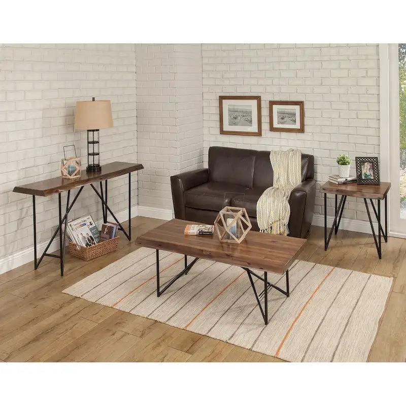 Spectacularly simple, the Live Edge Collection brings together form and function in these industrial-inspired pieces. Choosing sustainable wood resources, this group incorporates Acacia wood, metal legs that give stable support with a floating feel, with a warm walnut (brown) finish. Coordinate with matching end or console table sold separately.