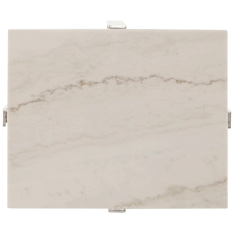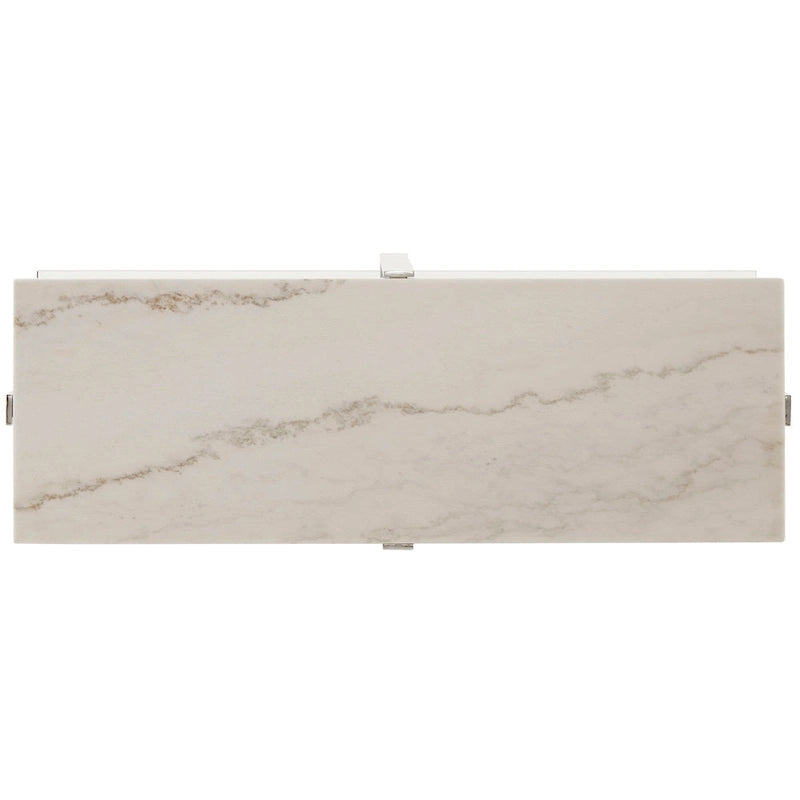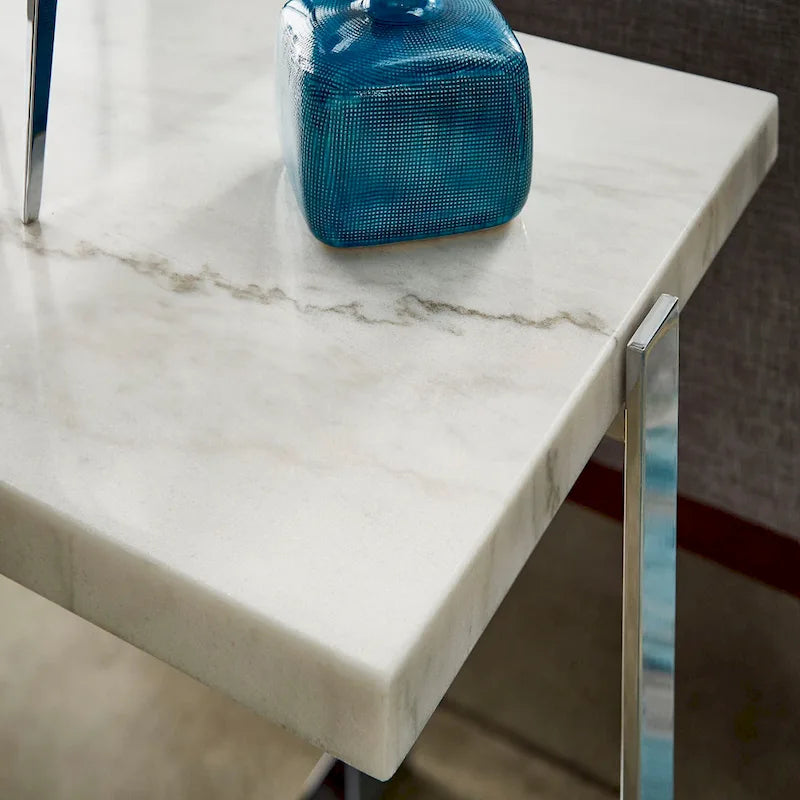 Complete your glam themed living space with the stunning iNSPIRE Q Azel marble-top chrome coffee table or table set. This beautiful, marble table top provides a gorgeous backdrop for a luxurious styled space, while the chrome finish of the sturdy crossed metal base adds a luminous, statement making aspect to an extravagant setting. Providing the perfect spot to display your most valuable home dcor items, this gorgeous sofa table also includes a middle glass shelf so additional novelty items can be shown off.