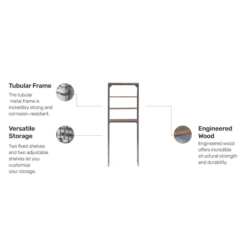 Turn any bathroom into a storage closet by adding this Homestyles Barnside Over-the-Commode Stand. This vertical storage solution stacks two fixed shelves and two adjustable shelves behind the toilet to add convenient storage in an otherwise unusable space. The dark gray wire-brushed finish gives this stand a desirable weathered look, but the powder-coated frame stands the test of time.