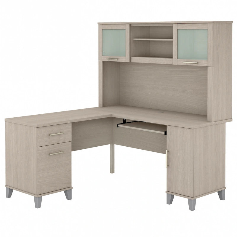 Maximize the potential of your home office with the Bush Furniture Somerset 60W L Shaped Desk with Hutch. This expansive workspace allows plenty of room to spread out and complete large projects. Create your remote work headquarters with space for your computer, phone, printer and more on a surface with wire management to keep cords and cables out of the way. A convenient pull-out shelf provides a perfect place to keep a keyboard or laptop, while a vertical storage cabinet with an adjustable shelf and a box drawer offer plenty of storage capacity for office supplies and writing utensils. A file drawer opens on smooth ball bearing slides for an easy reach to letter-size documents, even those all the way at the back. The Hutch features a large compartment with one adjustable shelf for books, binders or decorations. Two frosted glass doors provide concealed storage to eliminate visual clutter. Transitional styling includes your choice of several attractive finishes with tapered leg accents and contemporary metal hardware for an alluring appearance to match your current decor. This home office furniture set is tested to meet ANSI/SOHO standards for safety and performance and is backed by the Bush Furniture 6 Year Manufacturer's Warranty. See the full Somerset Collection for coordinating items available to complete your home office