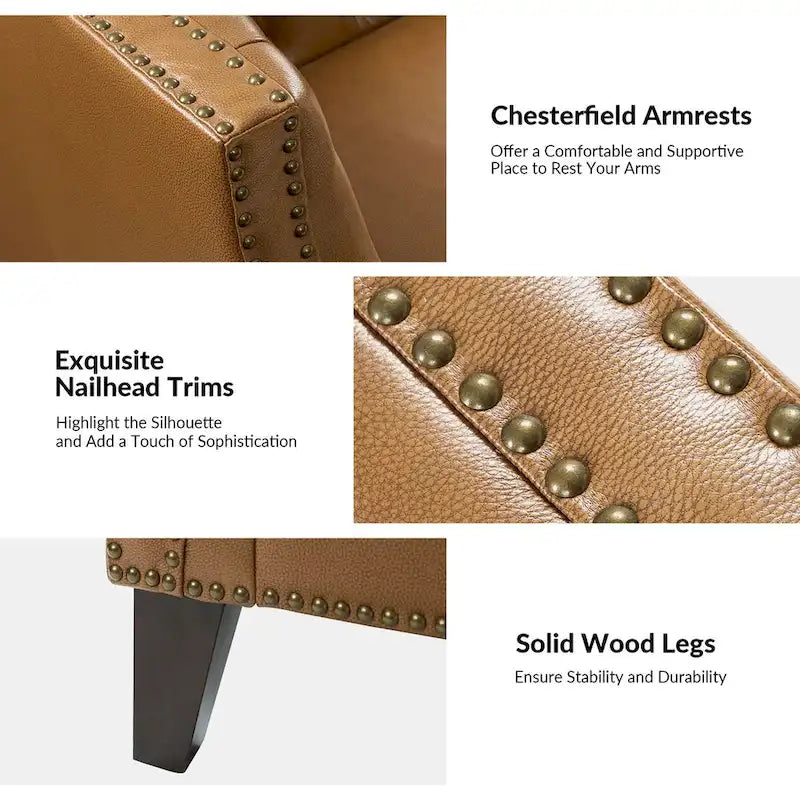 ThisTransitional Chesterfield sofablends contemporary and classic styles, featuringgenuine leatherupholstery for a luxurious touch. The design includestraditional button-tufting and nailhead trimthat enhance its sophisticated look. Thethick and plush seat cushionsoffer exceptional comfort, while thesturdy solid wood legsprovide a durable foundation. This elegant piece, with its mix of elements, is suitable for adding a touch of timeless elegance to any living space.