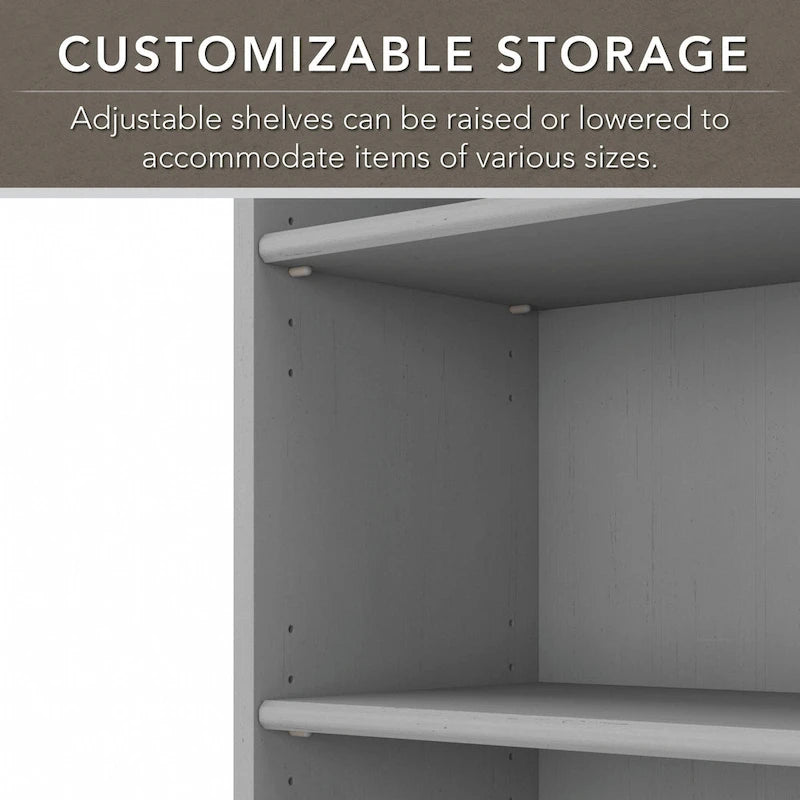 The Bush Furniture Fairview 60W L Shaped Desk with Hutch and 5 Shelf Bookcase offers a practical home office solution with modern farmhouse style. Enjoy your morning coffee, surf the net and pay bills with plenty of room to spare on the L Desk's durable work surface. Stash pens and paper in the box drawer and open cubby while keeping mail organized inside the letter-size file drawer. A vertical storage cabinet contains one adjustable shelf to accommodate materials of various sizes, and a convenient drawer with a drop-down front makes an ideal keyboard tray or laptop storage shelf. Along with two closed storage areas highlighted by stylish louvered doors, the Hutch features a large shelf with more than enough space for books, binders and decorations. Three smaller shelves keep work-in-progress organized so you can access current projects without breaking focus. The tall Bookcase includes three adjustable shelves for flexible storage and two fixed shelves for stability, making it easy to showcase your personal library along with pictures and home decor. Available in a variety of distressed finish options, all complemented by Antique Pewter hardware. This farmhouse desk set is tested to meet ANSI/SOHO standards for safety and performance and is backed by the Bush Furniture 6 Year Manufacturer's Warranty. See the full collection for coordinating items available.