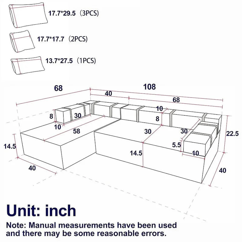 - Pillows Dimensions: 17.7x29.5 (3 pcs), 17.7x17.7 (2 pcs), 13.7x27.5 (1 pc)