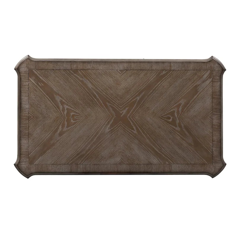 The perfect blend of European design with the Magnolia Manor. Crafted of poplar solids with white oak and birch veneers, this piece features a weathered brown top with whitewash, one fully stained interior drawer full extension drawer in each table, fancy face top, wood framed drawer fronts, bead molding, canted corners, faceted turned legs, cocktail offers casters that make rearranging effortless, antique pewter knob hardware and a bottom shelf for additional storage. Warm finishes and artistic distressing along with grand scale create a piece to be passed to generations. Kit consists of one cocktail table and two end tables.