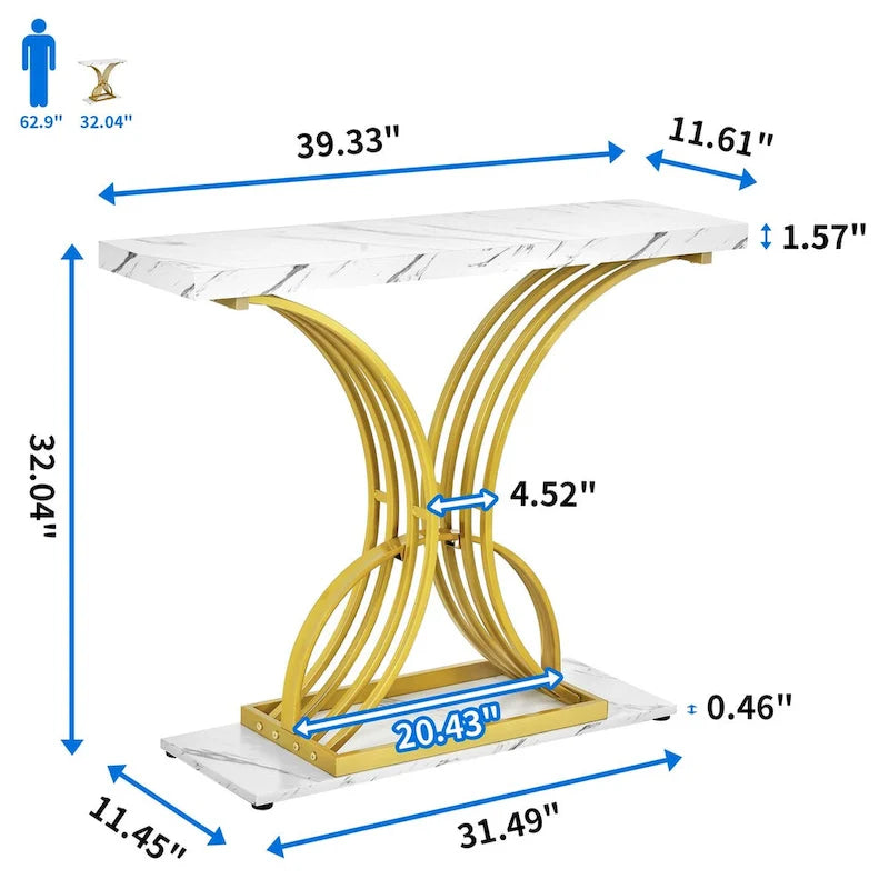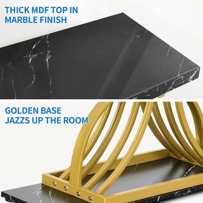 Elevate your space with our slim luxury sofa table, featuring a 1.57 thick MDF faux marble tabletop that is anti-scratch, water-resistant, and easy to clean. The dazzling gold frame with a symmetrical C shape adds a touch of distinction to your decor. This versatile table is perfect for small spaces, serving as a console, entryway, or front door table. Its sturdy construction ensures lasting strength, while foot pads protect your floor from scratches.