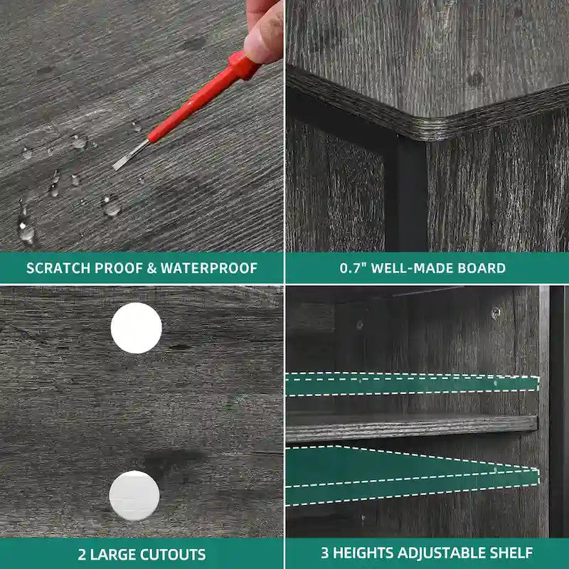 Introducing our modern farmhouse TV media console shelf equipped with power outlets and USB ports. This stylish and functional entertainment center accommodates flat screen TVs up to 55/50/48 inches and offers ample storage space. Its unique hexagonal design allows it to fit into corners easily, saving space. The TV stand is sturdy enough to hold up to 300lbs and features mesh doors with soft closing hinges. It perfectly integrates closed and open spaces for a versatile display.