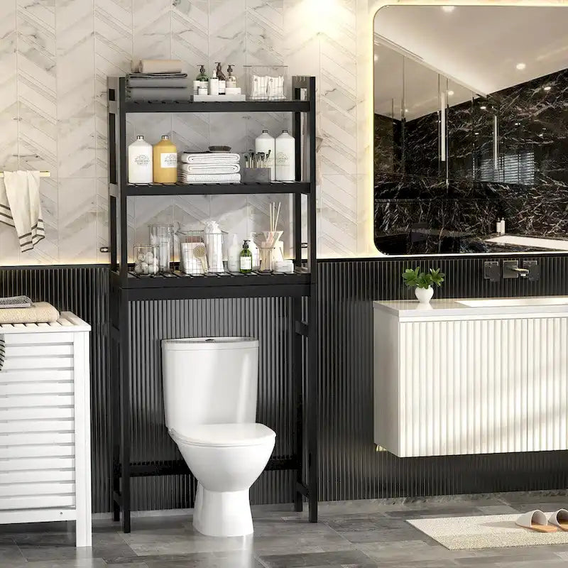 Maximize your bathroom space with our stylish Over-the-Toilet Storage Organizer. Designed to fit snugly behind most standard toilets with its dimensions of 24.8 W x 10.3 D x 66.7 H, this versatile shelf unit features a bottom shelf 35.6 from the floor and includes three removable stainless hooks for added convenience. Ideal for organizing toilet paper, shampoos, shower gels, towels, hairdryers, and even plants, this organizer is perfect for small bathrooms. Crafted from durable bamboo with a sleek finish, it combines modern design with natural elegance, available in white, espresso, gray, pink, and natural hues. The adjustable bottom bar accommodates various toilet heights, and the multifunctional design allows it to serve as a storage solution for your laundry room or as a display rack for plants on your balcony. Assembly is straightforward with included instructions and tools, plus anti-tilt kits ensure stability and safety. Bamboo's quick growth and resilience make it an eco-friendly choice, offering the strength of traditional hardwoods while being gentle on the environment.