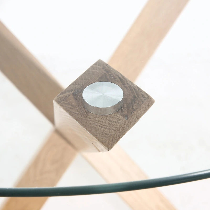 Elevate your dining space with the Poly and Bark Kennedy 37.4 inch Round Dining Table. A beautiful blend of style and functionality, this glass dining table features a solid rubberwood base with an American oak veneer and three angled posts that create a star-inspired silhouette. A thick round of tempered glass rests on top, providing a stunning focal point for your dining area while also ensuring durability. Whether you're enjoying a romantic dinner for two or hosting a small gathering, this table comfortably seats three to four people. Some assembly is required, taking approximately 20 minutes to complete.
