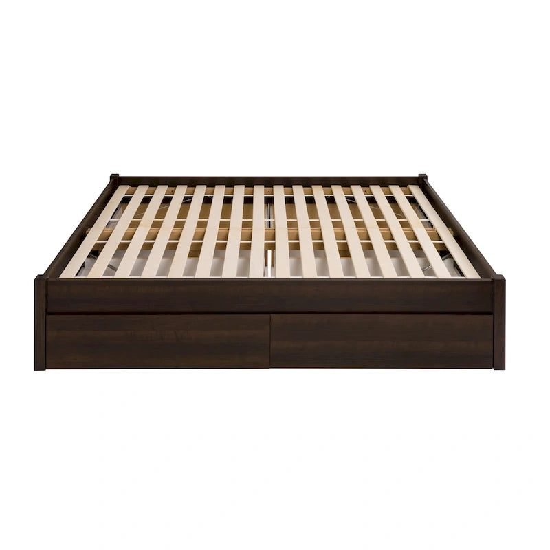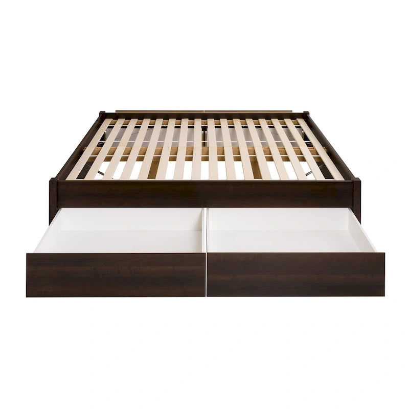 Upgrade your bedroom with the Prepac Queen Select 4-Post Platform Bed, a stylish and functional piece that provides balanced support for your body and mattress. This sturdy bed features a wood frame and slat system that replaces the need for a box spring foundation, and it comes with the option to add drawers for convenient under-bed storage. Constructed from non-toxic laminated composite woods and finished in durable laminate, this bed is CARB-2 compliant and available in black, driftwood grey, espresso, or white. With custom hardware to keep the bed aligned, this platform bed is easy to assemble and supports up to 500 lbs.