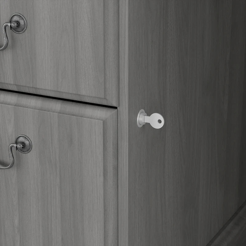 The Bush Furniture Saratoga Executive Desk with File Cabinet and Bookcase Set presents a practical, durable workspace that reflects the refined elegance of timeless traditional styling. A spacious 66W x 30D work surface provides plenty of room to spread out with a computer and all the materials you need to finish the task at hand, no matter if you're working on an important project, paying bills or just surfing the web. The sturdy desktop supports up to 200 pounds while three file drawers, two box drawers and a center pencil drawer ensure that office supplies are never out of reach. Organize letter, legal and A4-size paperwork inside the 2 Drawer Lateral File Cabinet. Drawers open on smooth full-extension ball bearing slides for an effortless reach to contents, and the upper drawer can be locked to protect documents with sensitive information. The matching Tall 5 Shelf Bookcases both feature three adjustable shelves for flexible storage and two fixed shelves for stability. Each shelf supports up to 25 pounds, so you can showcase your personal library and display larger decorations with confidence. Find the perfect look to complement your work or living space with three distinct finish options: Linen White Oak and Modern Gray with Distressed Iron hardware or Harvest Cherry with Gold-finished Brass hardware. This Executive Desk Set has been tested to meet ANSI/BIFMA quality standards for safety and performance and is backed by the Bush Furniture 10 Year Manufacturer's Warranty.