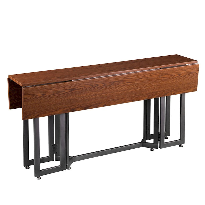 A leg up. With the Driness Drop Leaf Table, small space dining is a snap. Easy-use drop leaf smoothly operates for a dining table that converts to a console in seconds. Dark tobacco tabletop and gunmetal gray legs make a great team; simple lines and contemporary composition work well with any style. Feast your eyes on a good time with this gate-leg table as a dinette, table tennis locale, or desk the Driness does it all.