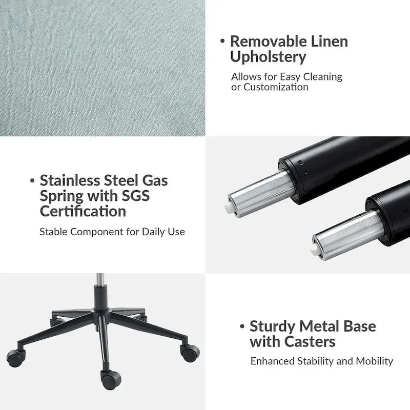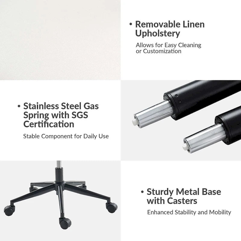 This modern home office chair blends sleek design with ergonomic functionality. Its SGS International Certified Stainless Steel Gas Spring guarantees durability and safety. The chair in camel color is made of vegan leather, and the chair in other colors is made of linen and vegan leather. Supported by sturdy metal legs and equipped with smooth casters, it offers mobility and stability. The swivel seat enhances flexibility, while the up-and-down adjustment feature caters to individual preferences. Additionally, its tilting capability allows for relaxed movement during long hours of work. With a removable line cushion upholstery, this chair effortlessly merges style with practicality, making it an ideal choice for any modern home office or workspace.
