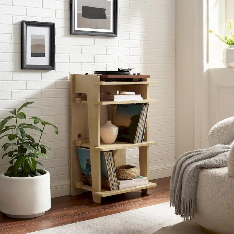 - Vinyl record storage holds up to 200 albums total with a maximum weight limit of 45lbs per shelf