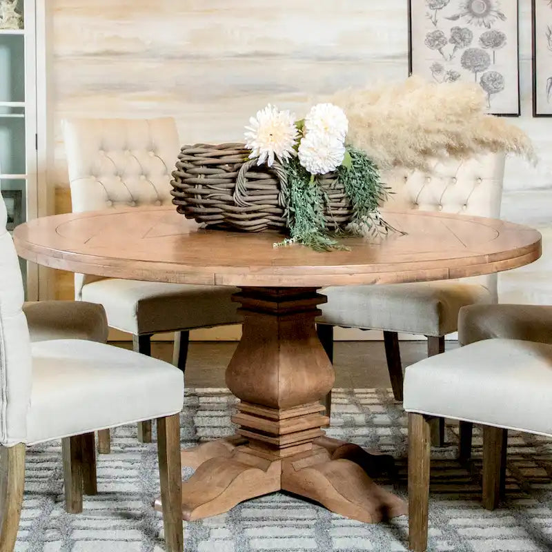 Highlight your home's traditional theme with the addition of this French neoclassical-inspired round table into your dining ensemble. Made from solid pine and mahogany for long-wearing durability, this dining table lends a timeworn look to your interior with its distressed styling and rustic smoke finish. For an authentic old-fashioned look, this table features finger joint construction. The intricate details at the pedestal base add to the timeless quality of this striking furniture, while the round surface makes it an ideal choice for a small dining area.